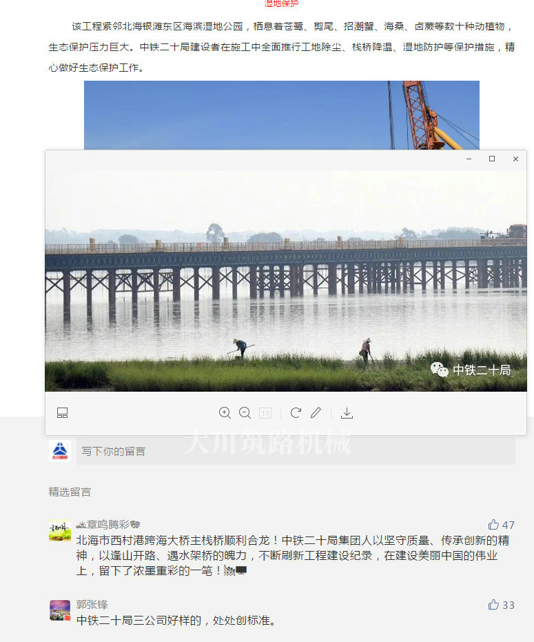 該工程緊鄰北海銀灘東區(qū)海濱濕地公園,棲息著蒼鷺、剪尾、招潮蟹、海桑、鹵蕨等數(shù)十種動植物,生態(tài)保護壓力巨大。中鐵二十局建設者在施工中全面推行工地除塵、棧橋降溫、濕地防護等保護措施,精心做好生態(tài)保護工作。